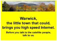 Warwick Broadband Service is 30 times faster than dial-up and twice as fast as residential satellite. The cost for up to 1 Mb down and .5 Mb up is only $50 per month, addition to a one-time installation fee. For more information, call David Young at 978.544.6315.