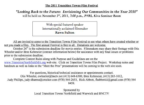 Learn more about the Transition Movement at http://www.transitionus.org, or pick up a copy of The Transition Handbook: From Oil Dependency to Local Resilience by Rob Hopkins at the library today.