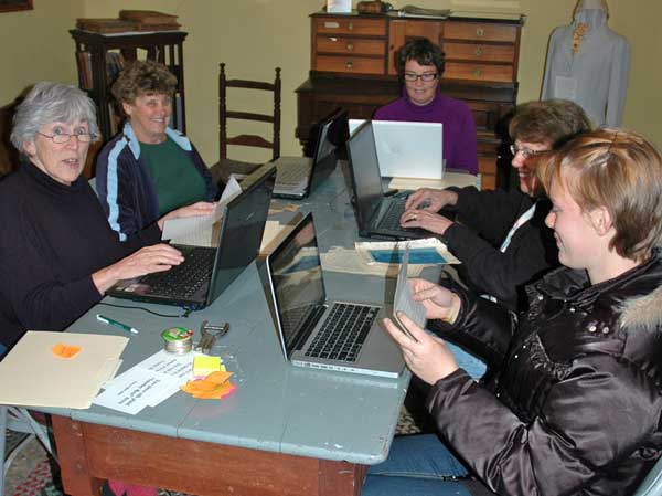 Freddie Fellows, Liz Whipple, Deb Paulson, Bev Shepardson and Nadia Marti entering data