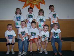 In the first photo, Warwick schoolchildren display their new t-shirts, created with a press purchased by the Foundation. In the second, Nora Dooley explains how a book is made, sponsored by the Foundation.